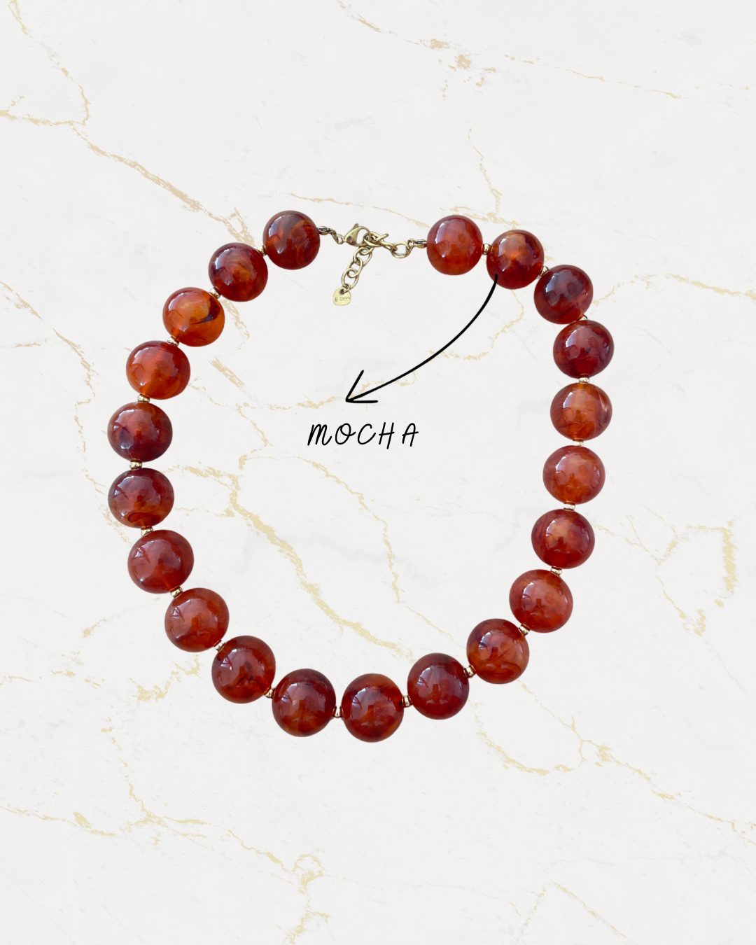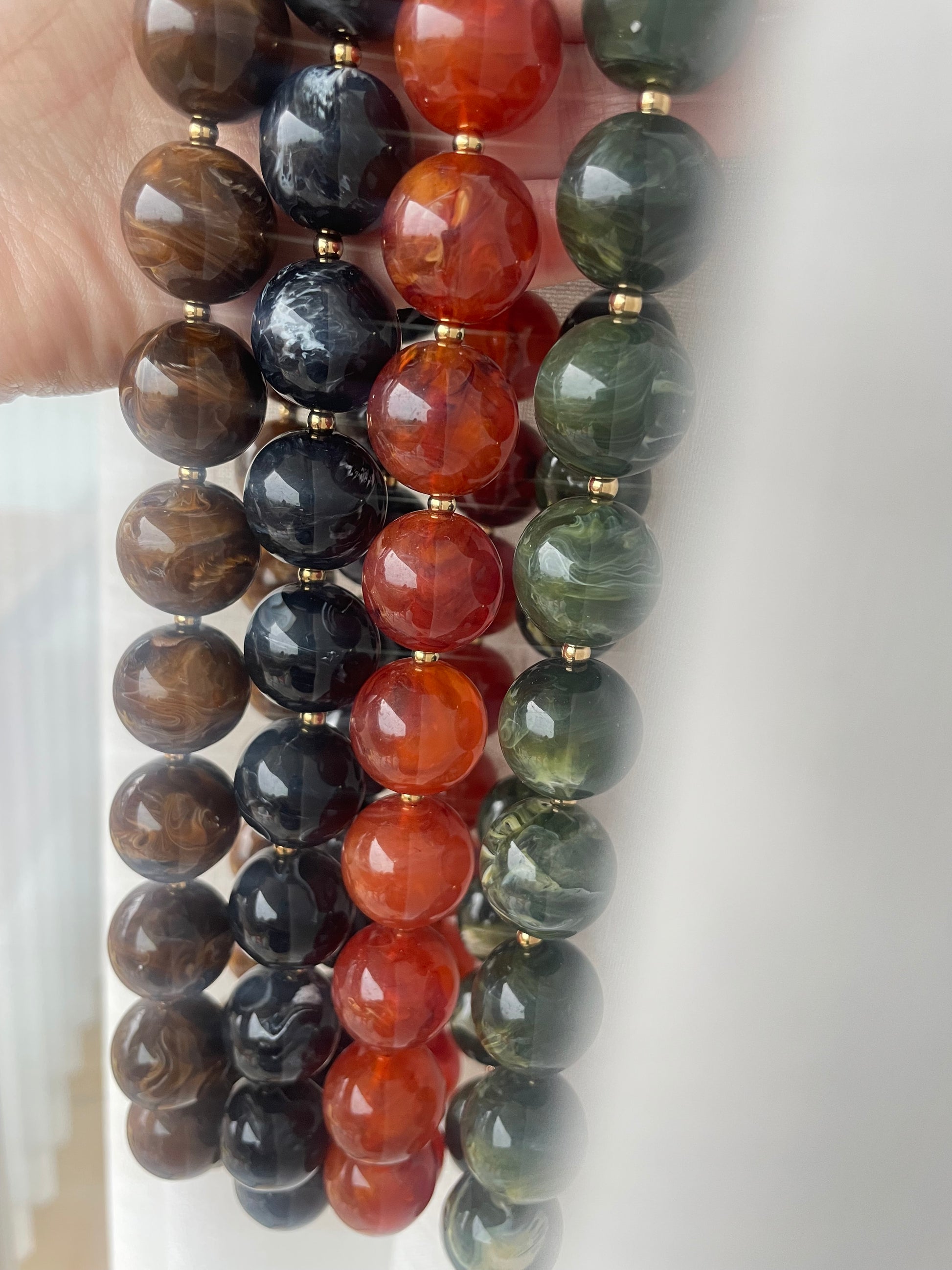 Colar de bolas de resina em várias cores, missangas de aço inoxidável dourado e acabamentos em aço inoxidável.