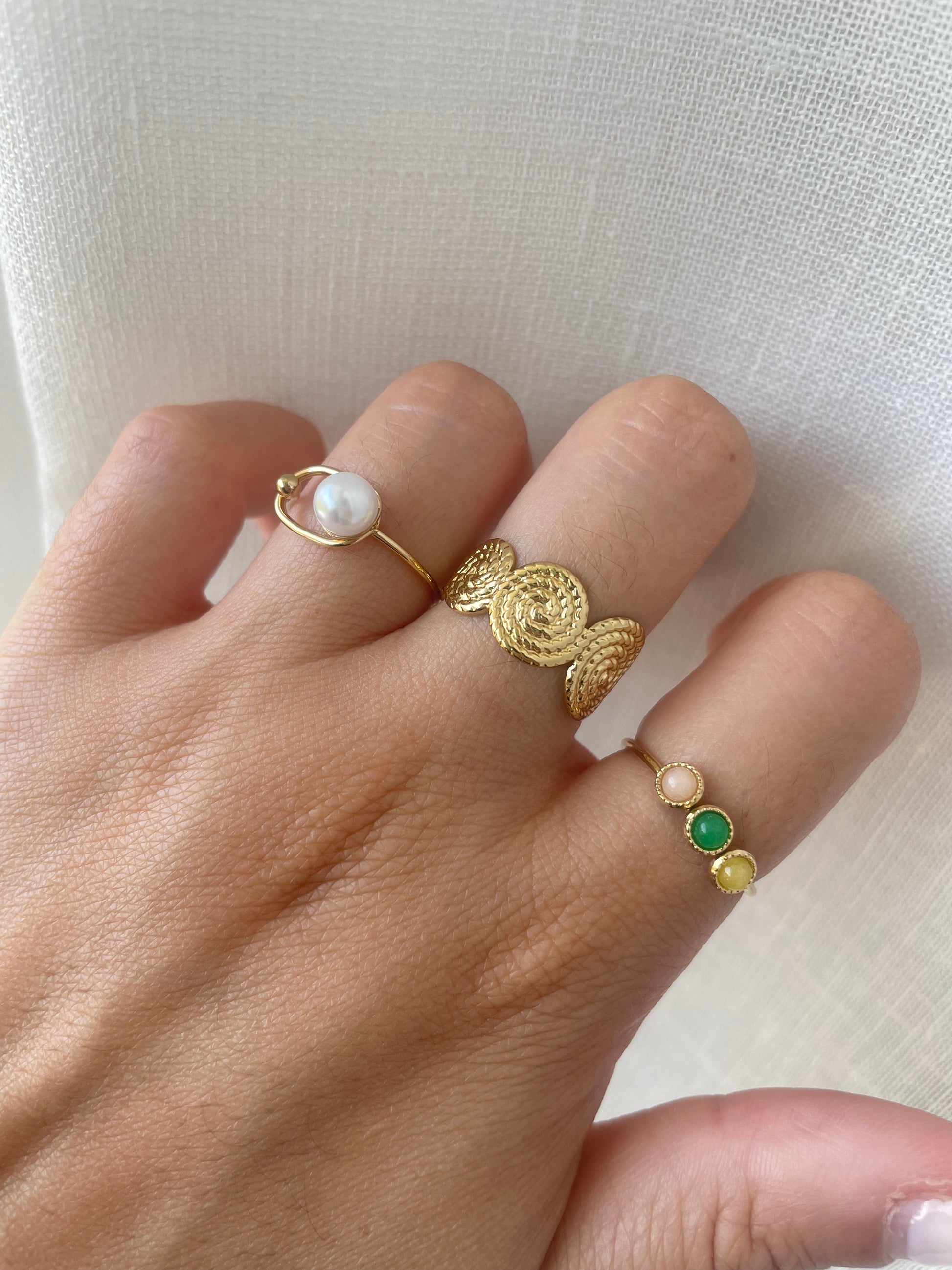 Anel ajustável de aço inoxidável e banho de ouro. Com aplicação de 3 mini pedras
