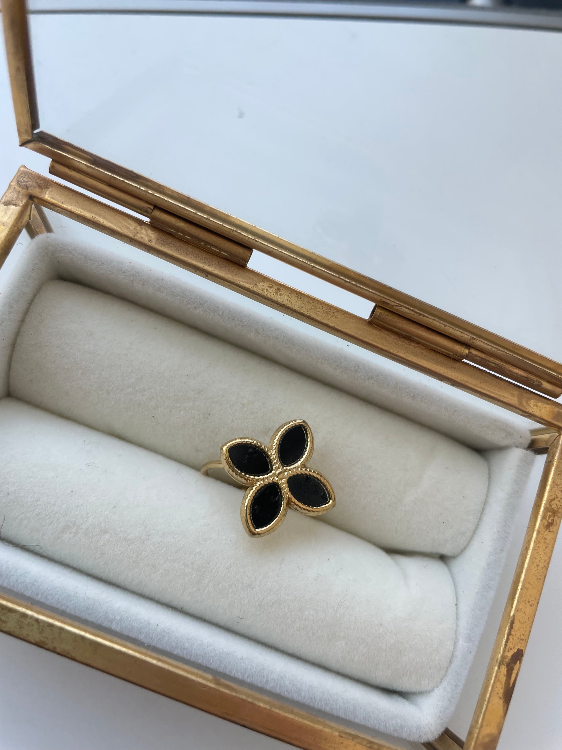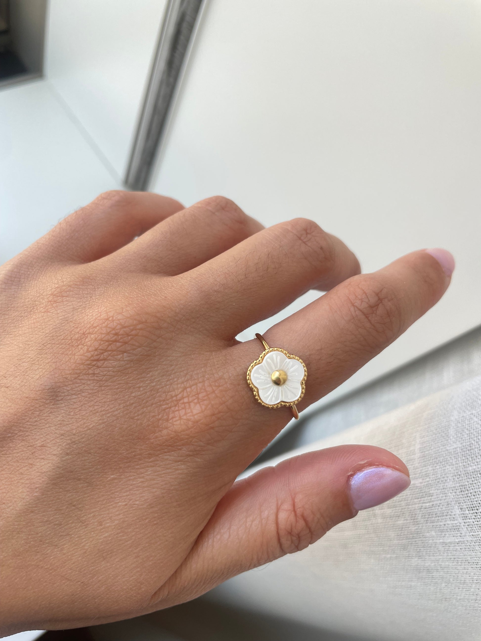 Anel ajustável em aço inoxidável e banho de ouro. Flor resinada em branco pérola ou preto