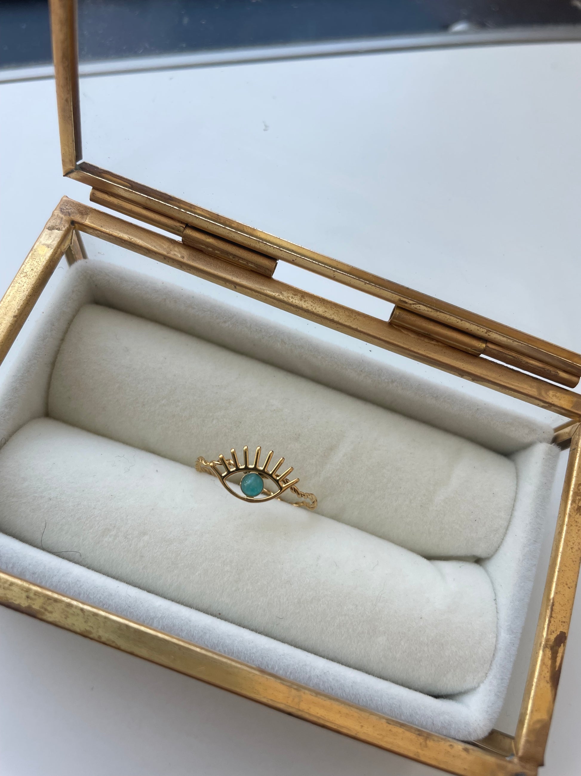 Anel ajustável em aço inoxidável e banho de ouro. Com aplicação de pedra azul