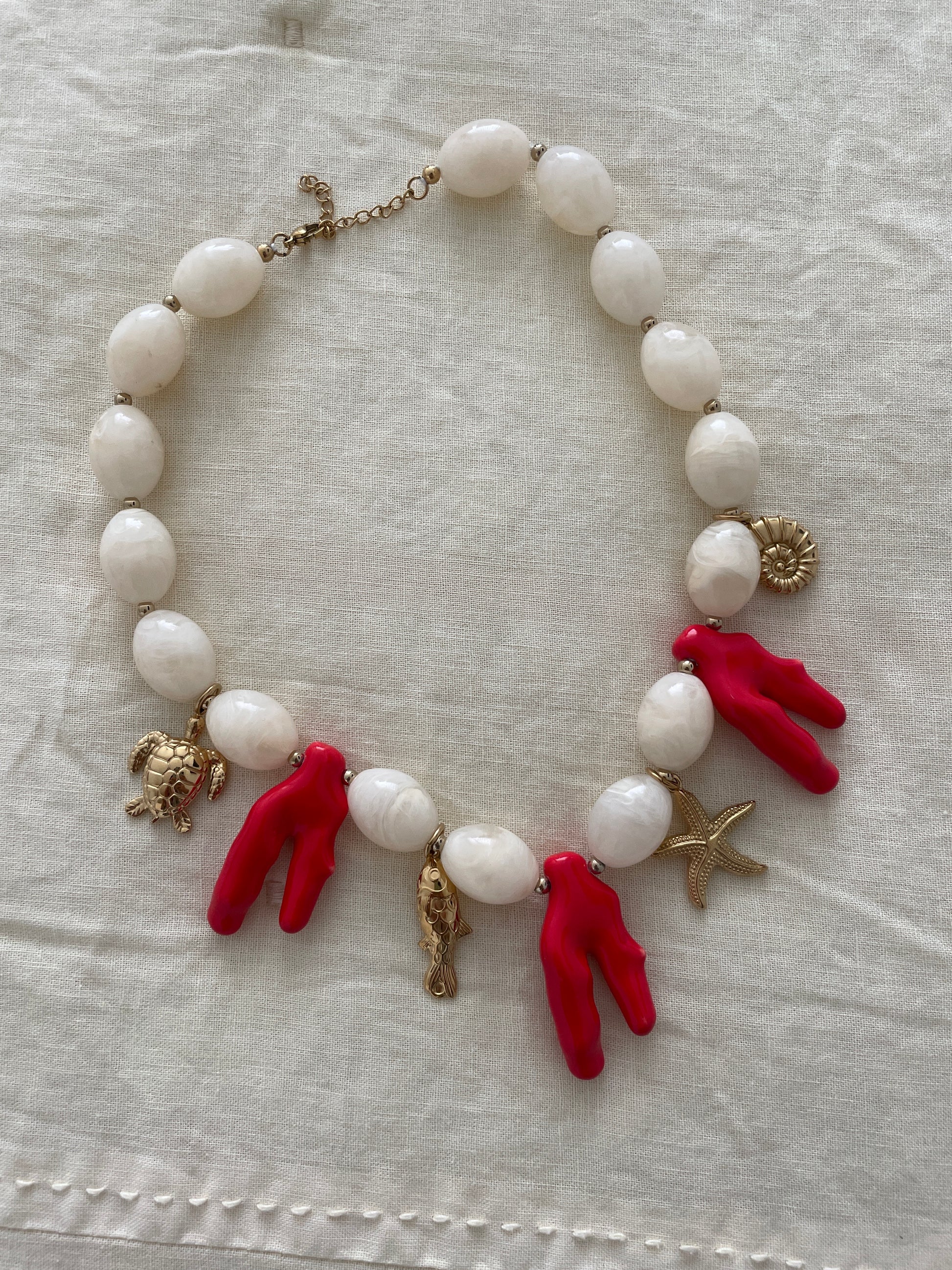 Colar de contas acrílicas madrepérola e pingentes vermelhos.