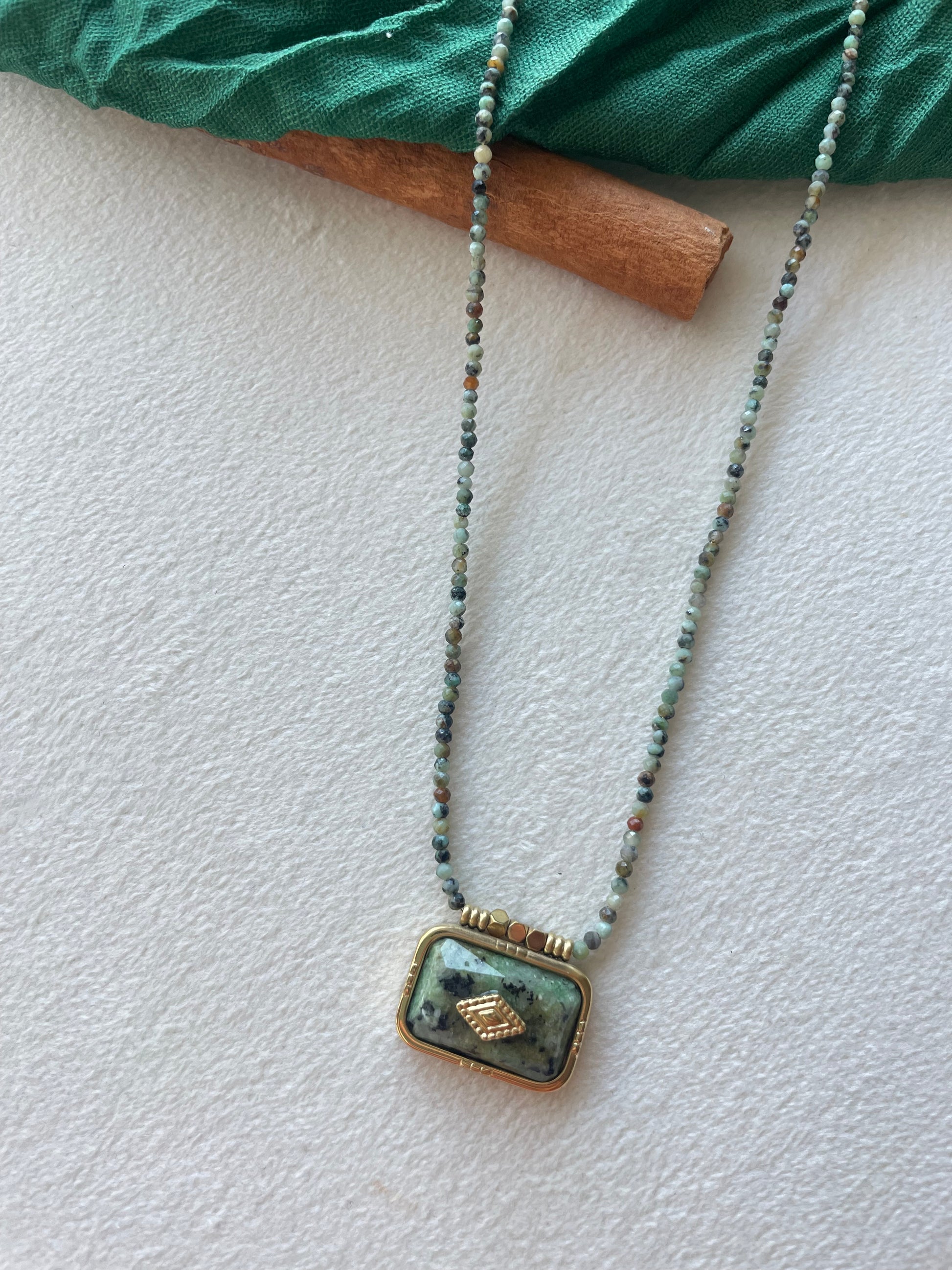 Colar composto por contas de esmeralda natural, contas de aço inoxidável e pendente grande também de esmeralda.