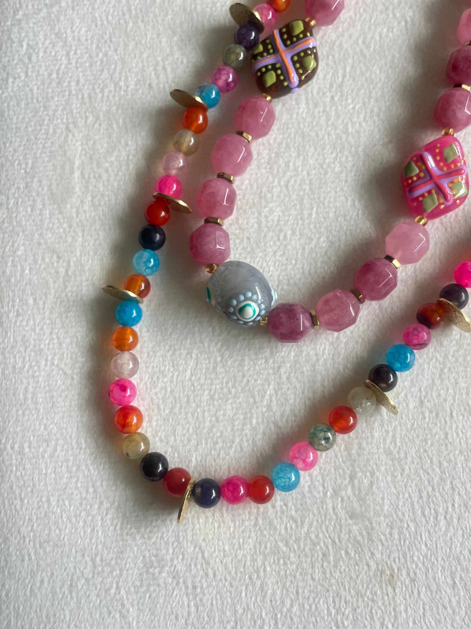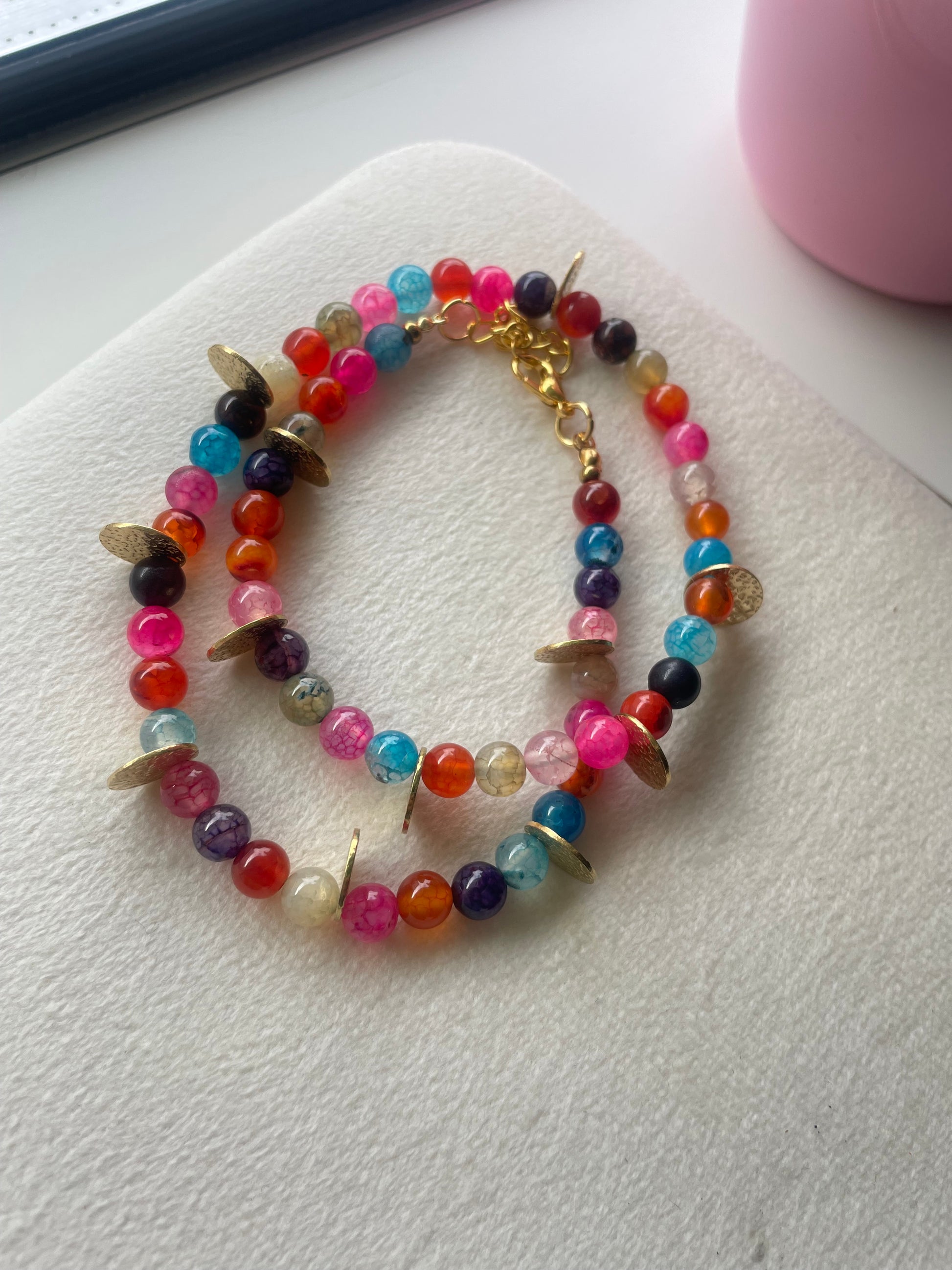 Colar de pedra natural colorida e acabamentos em aço inoxidável.
