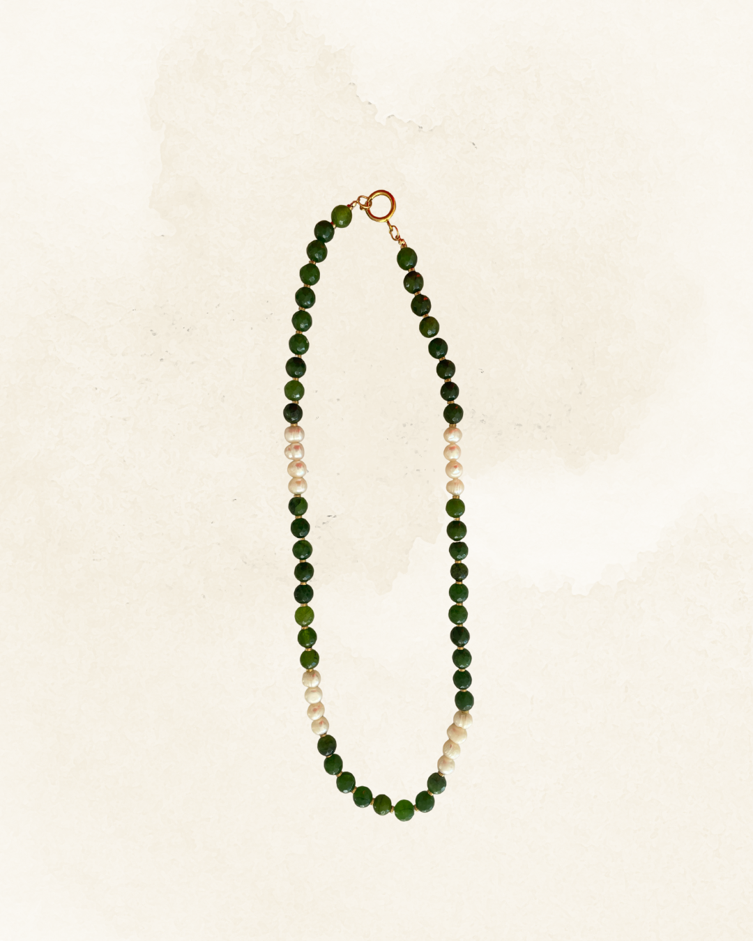 Colar de pedra natural jade e perolas barrocas. Acabamentos em aço inoxidável