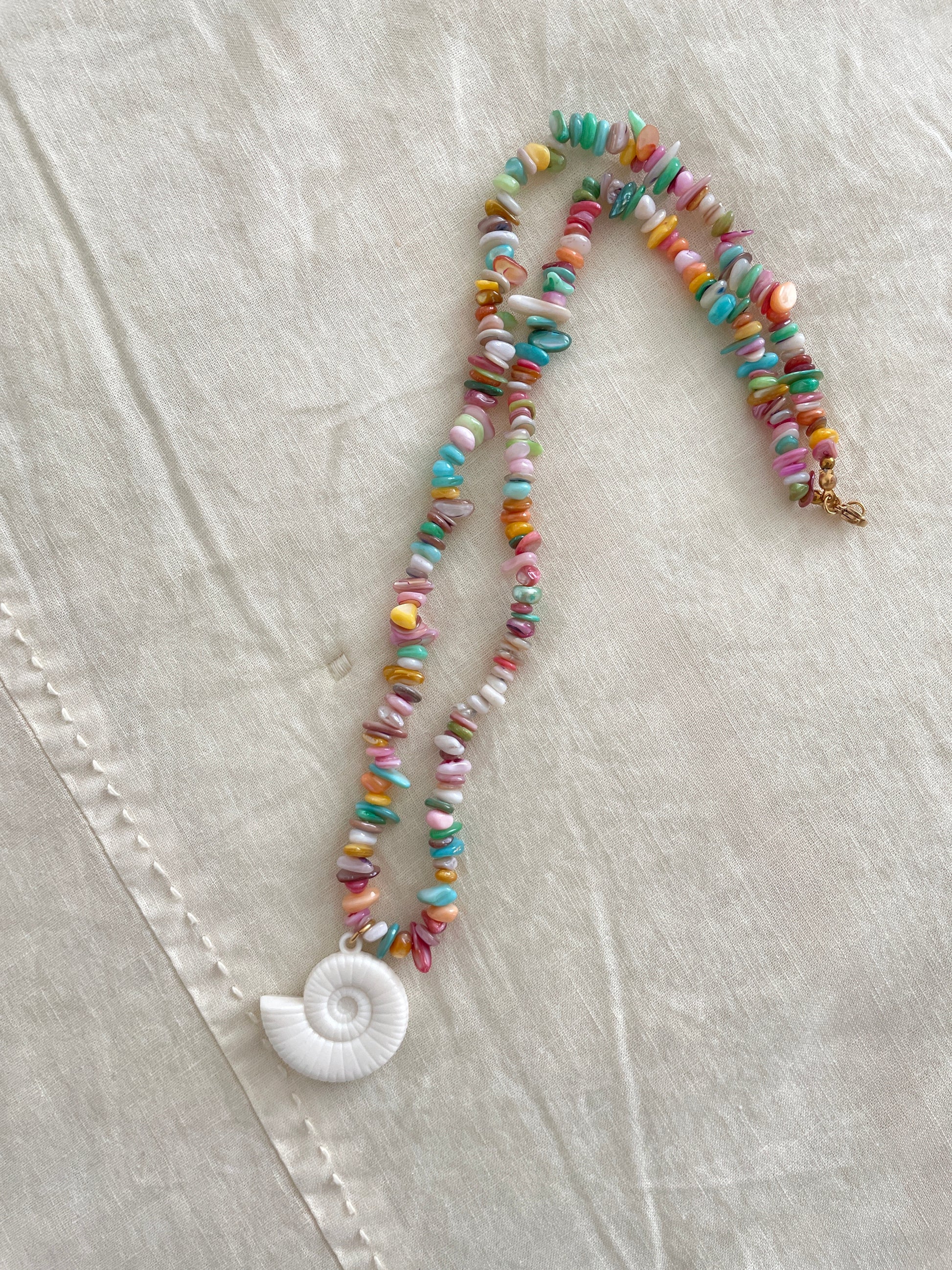 Colar com cascalho natural colorido. Pendente de concha em acrílico.