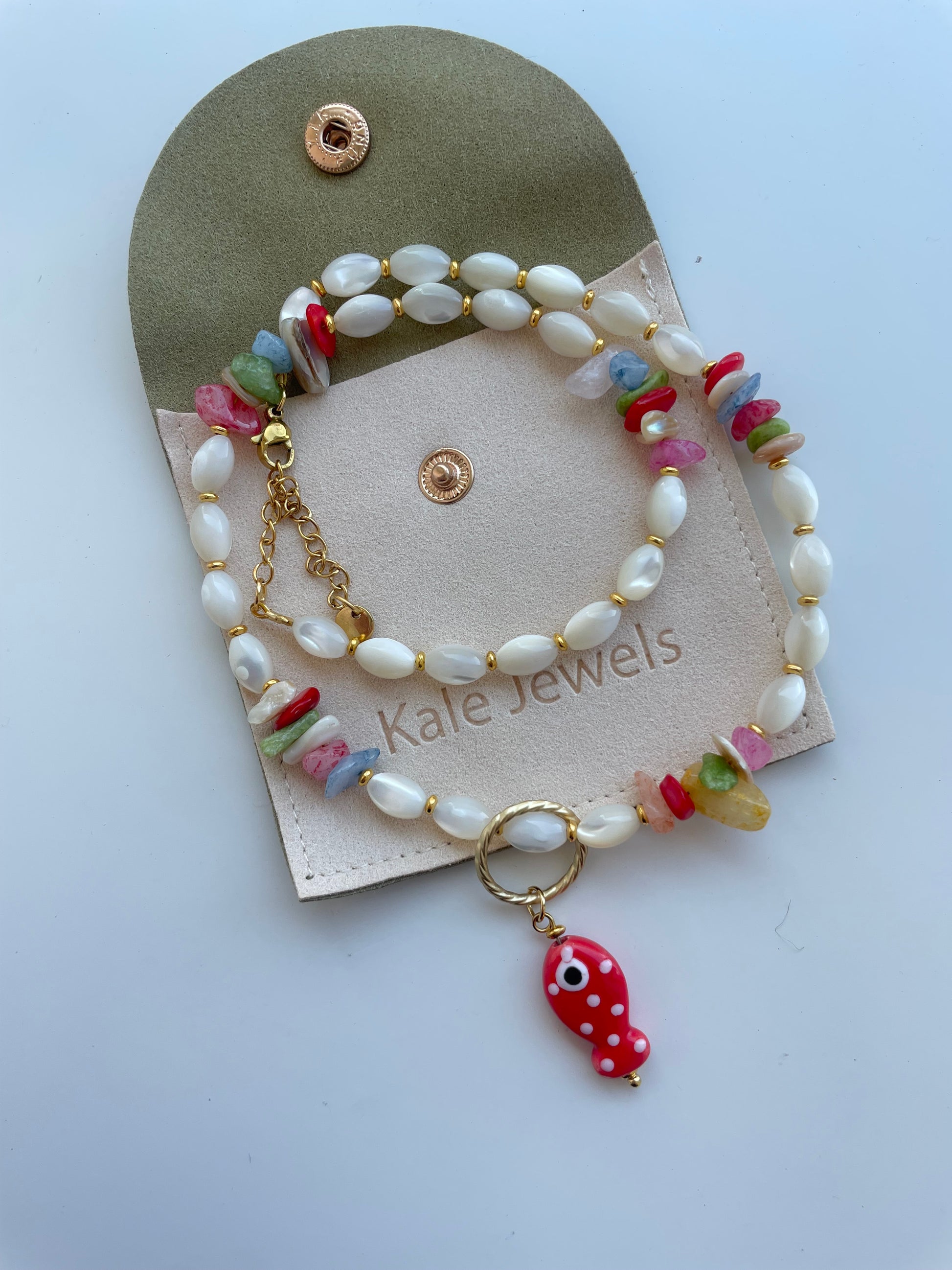 Colar de pedra natural e acabamentos em aço inoxidável. Círculo de aço inoxidável e peixinho em cerâmica