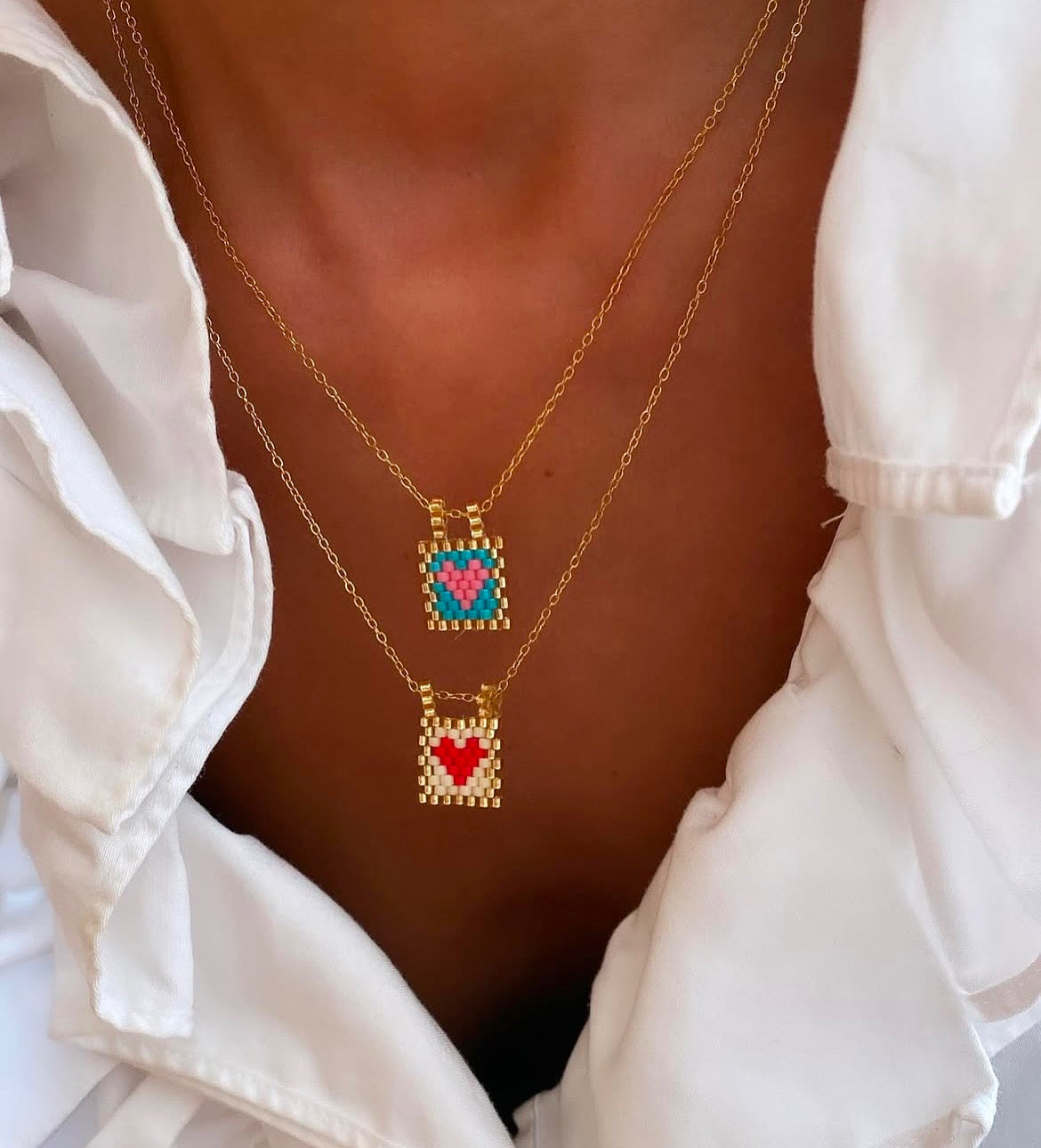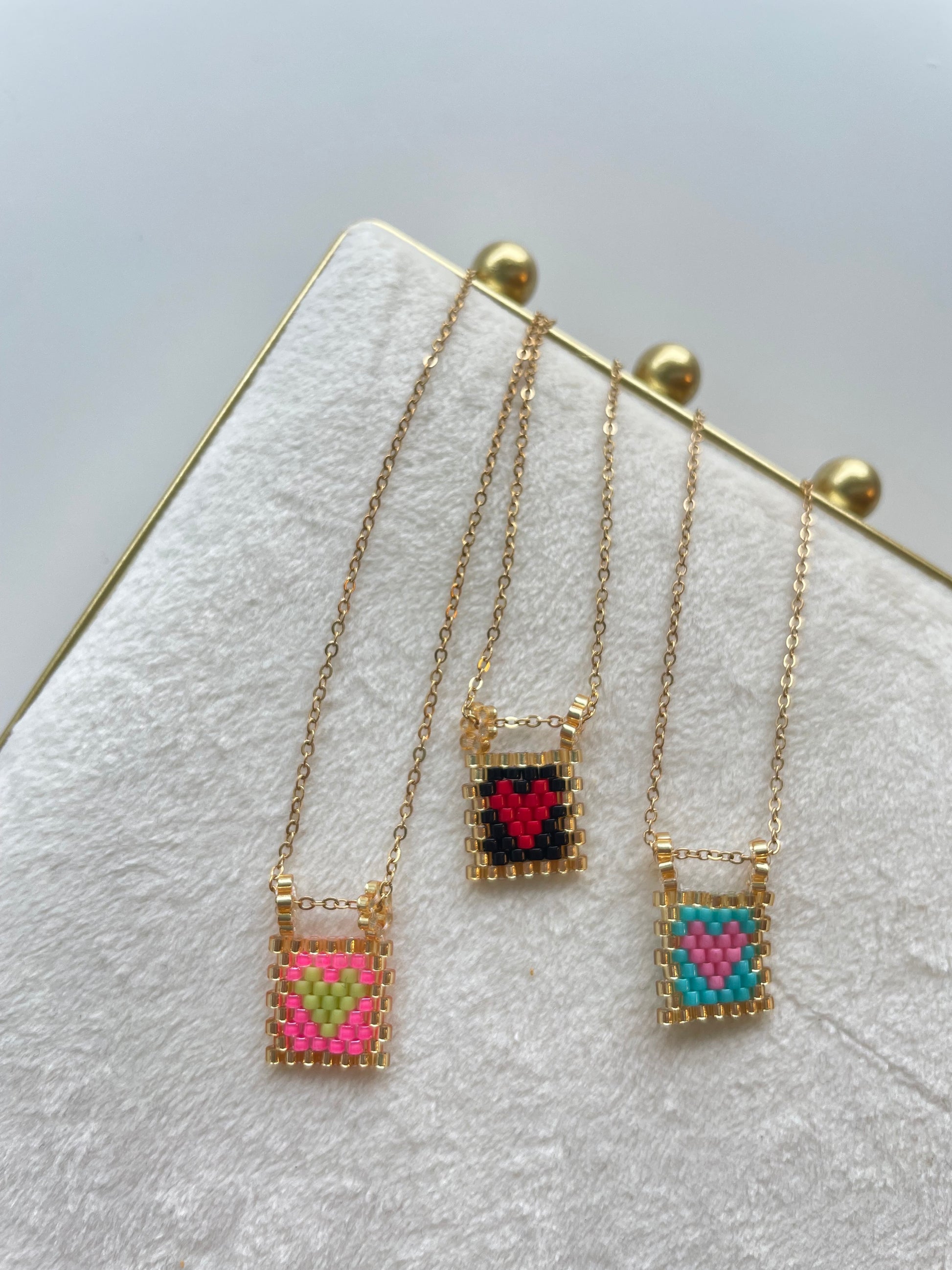 Colar em aço inoxidável e banho de ouro 18k com pendente de missangas feito a mão.