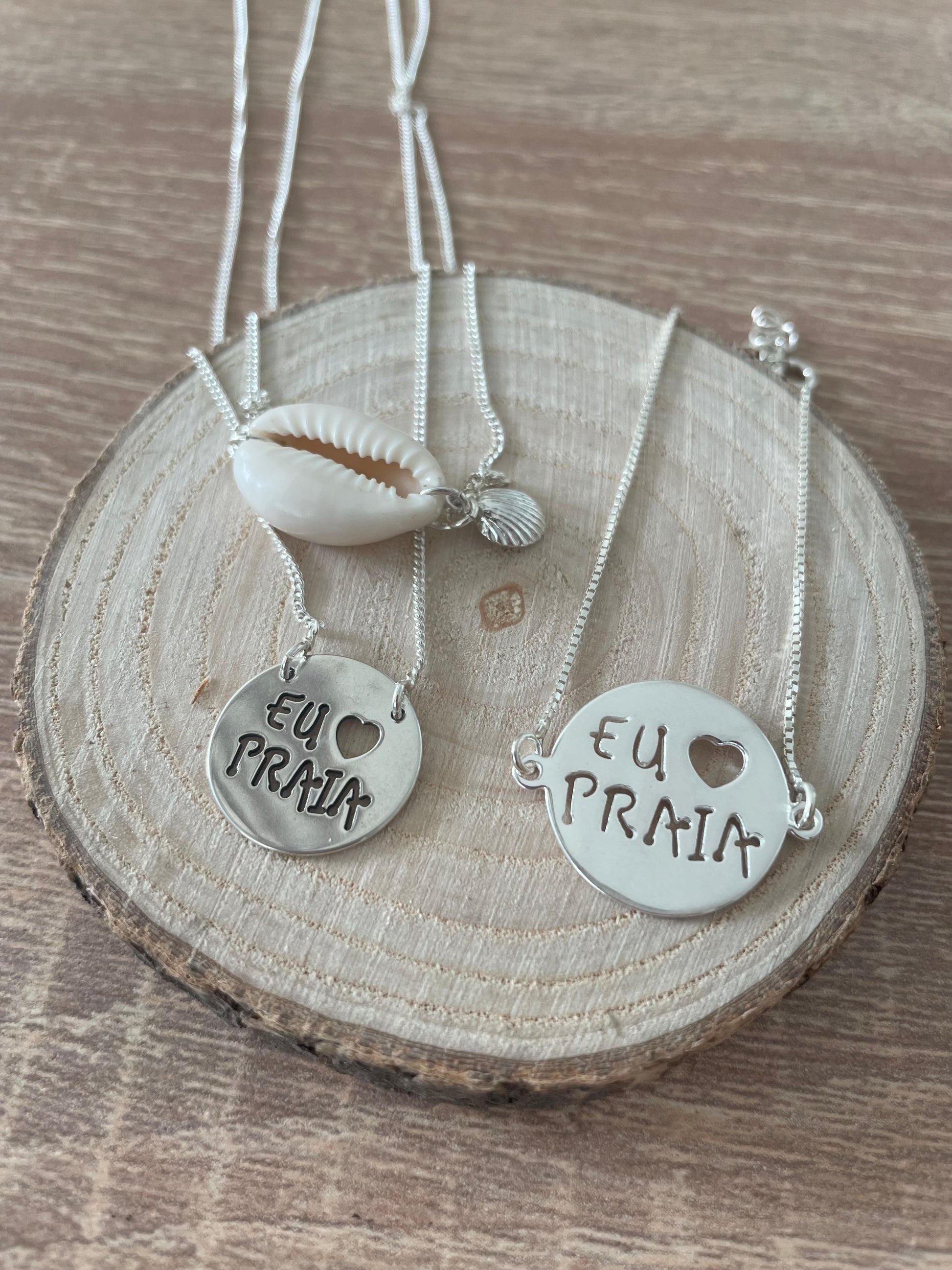 Escapulário de 70cm em Prata 925 ‘Eu amo Praia’ e aplique de búzio e concha em Prata